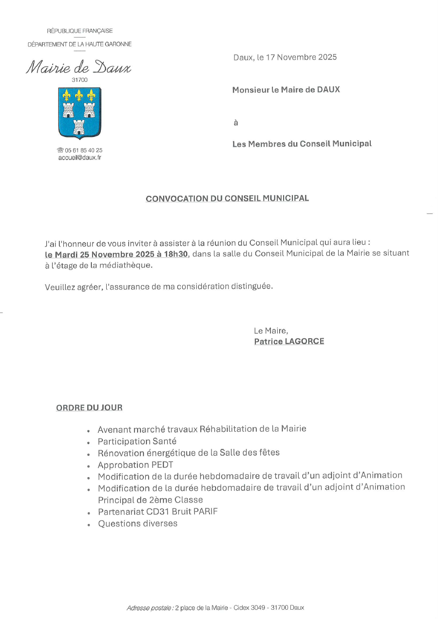 Le prochain conseil municipal aura lieu le 25 novembre.